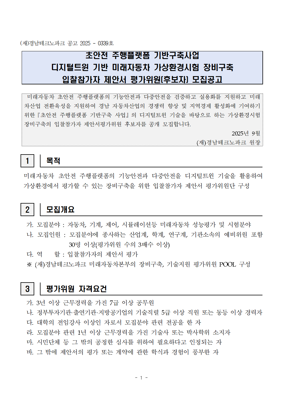 초안전 주행플랫폼 기반구축사업 디지털트윈 기반 미래자동차 가상환경시험 장비구축 입찰참가자 제안서 평가위원(후보자) 모집공고