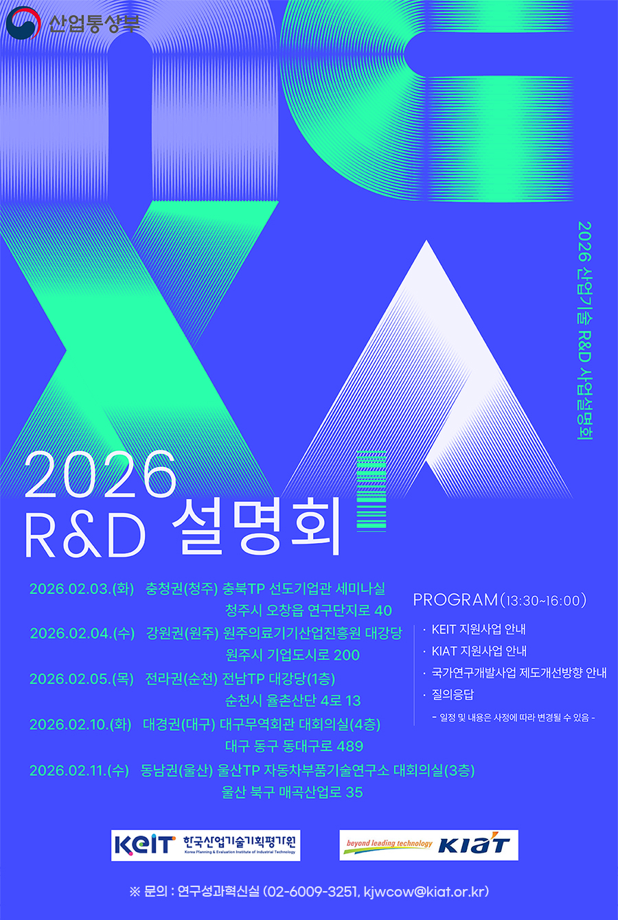 한국산업기술기획평가원과 KIAT에서 2026 산업기술 R&D 사업설명회를 개최하고자 하오니 많은 관심 부탁드립니다.